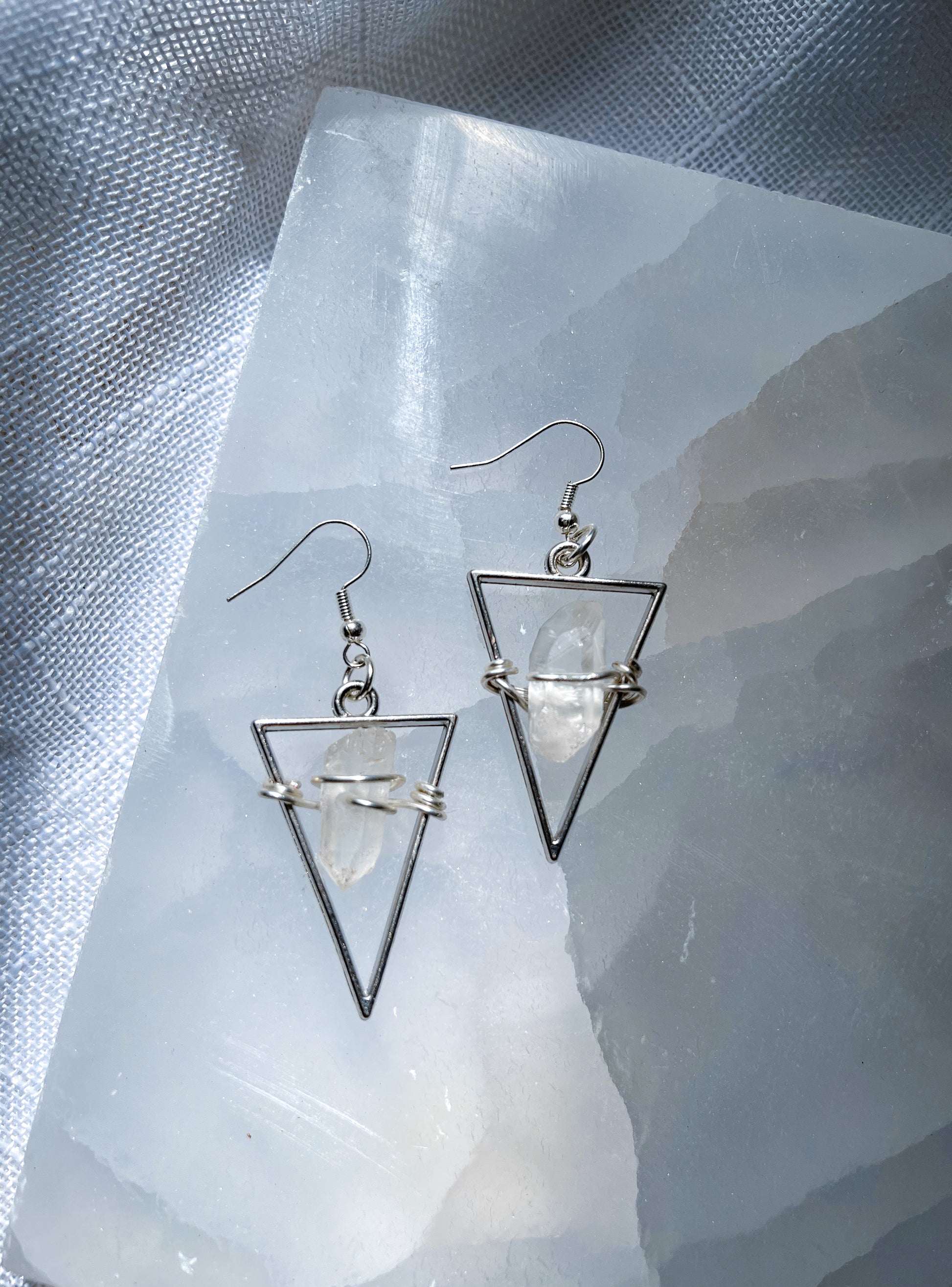 Each earring is wire wrapped with cleansed crystals. The Crystal Quartz is a powerful balancing stone. It’s a very high vibrational stone helping the crown and third eye chakra. This stone is perfect for healing of all kinds, promoting clarity and creativity. This will also enhance other crystals!
