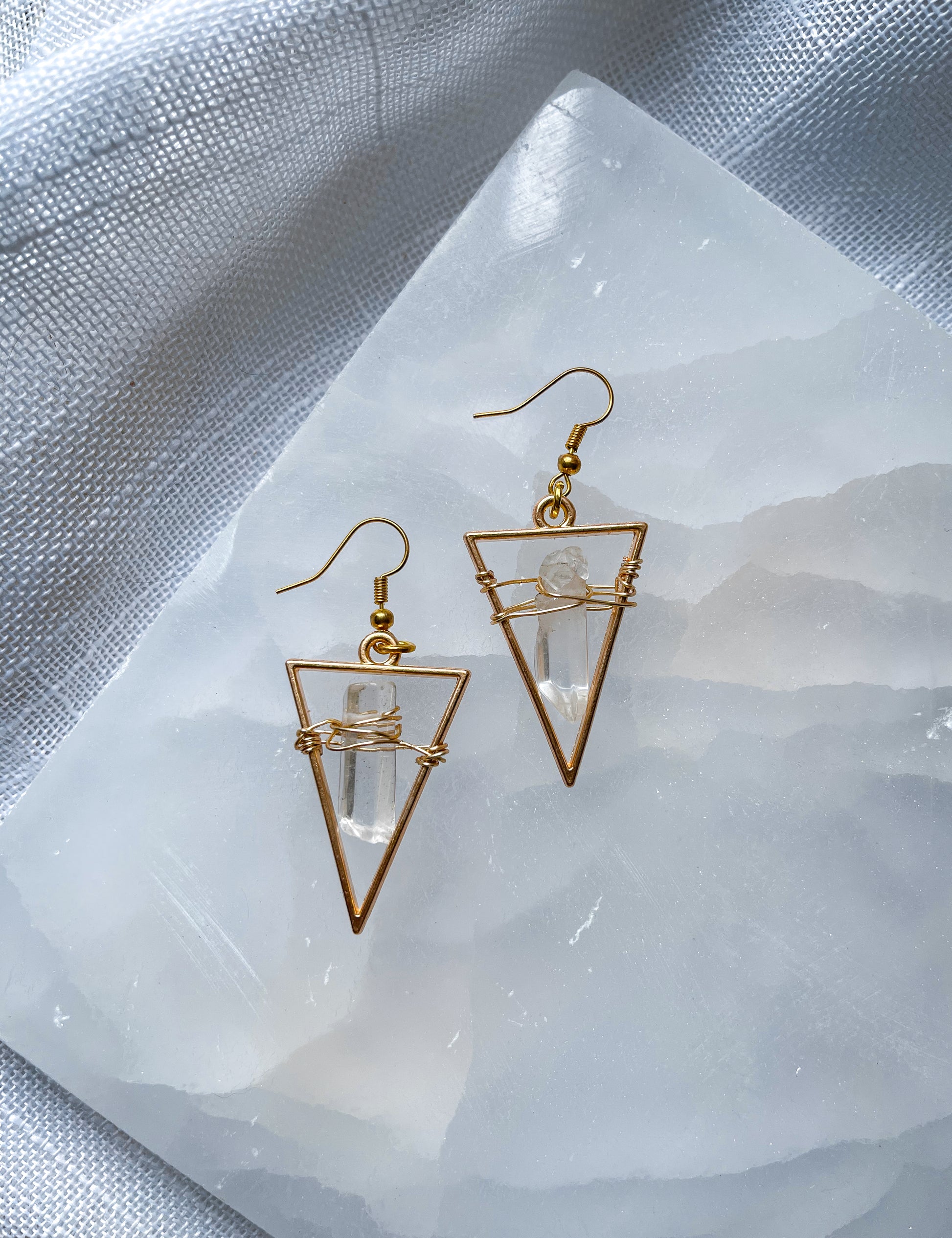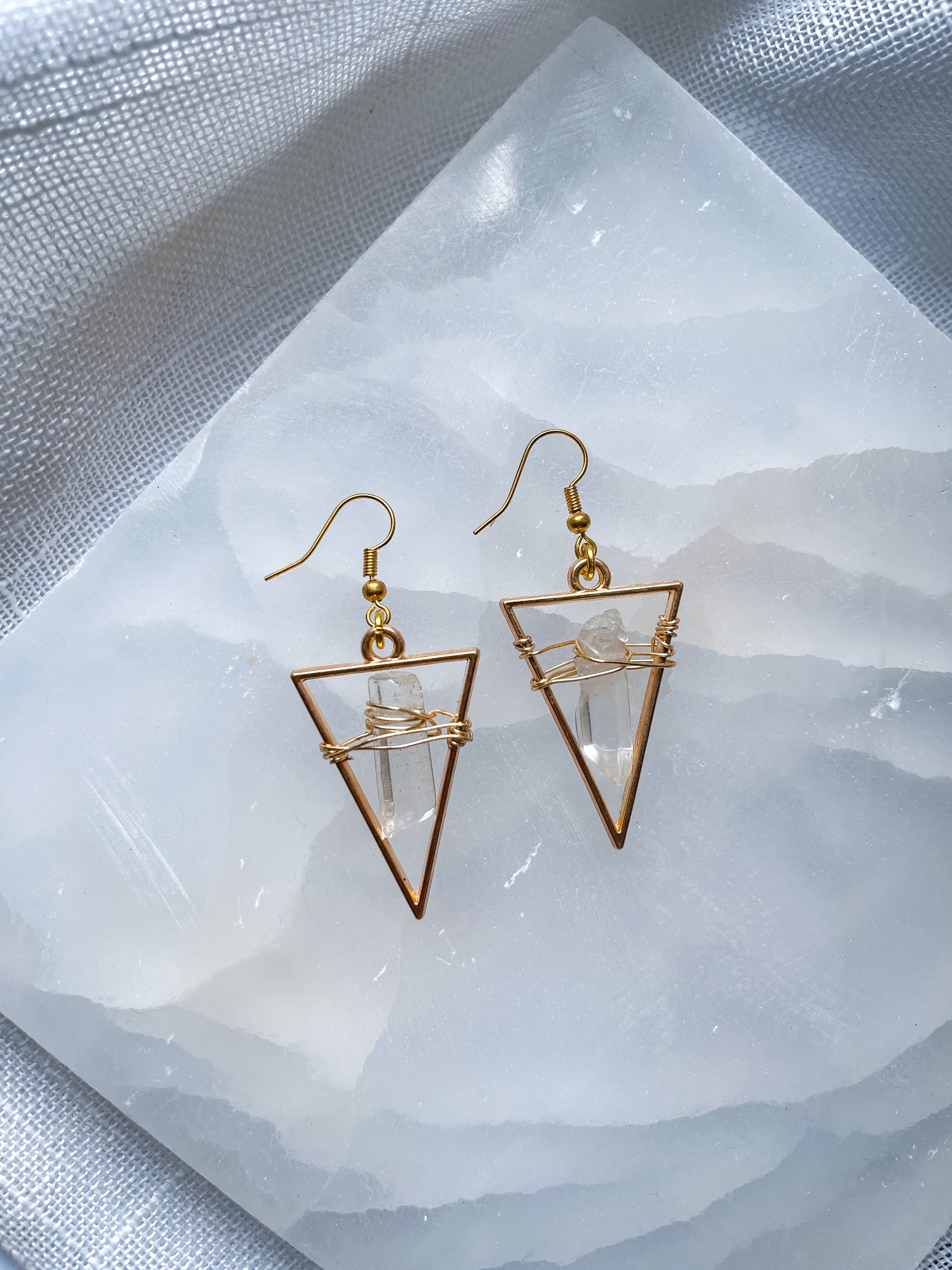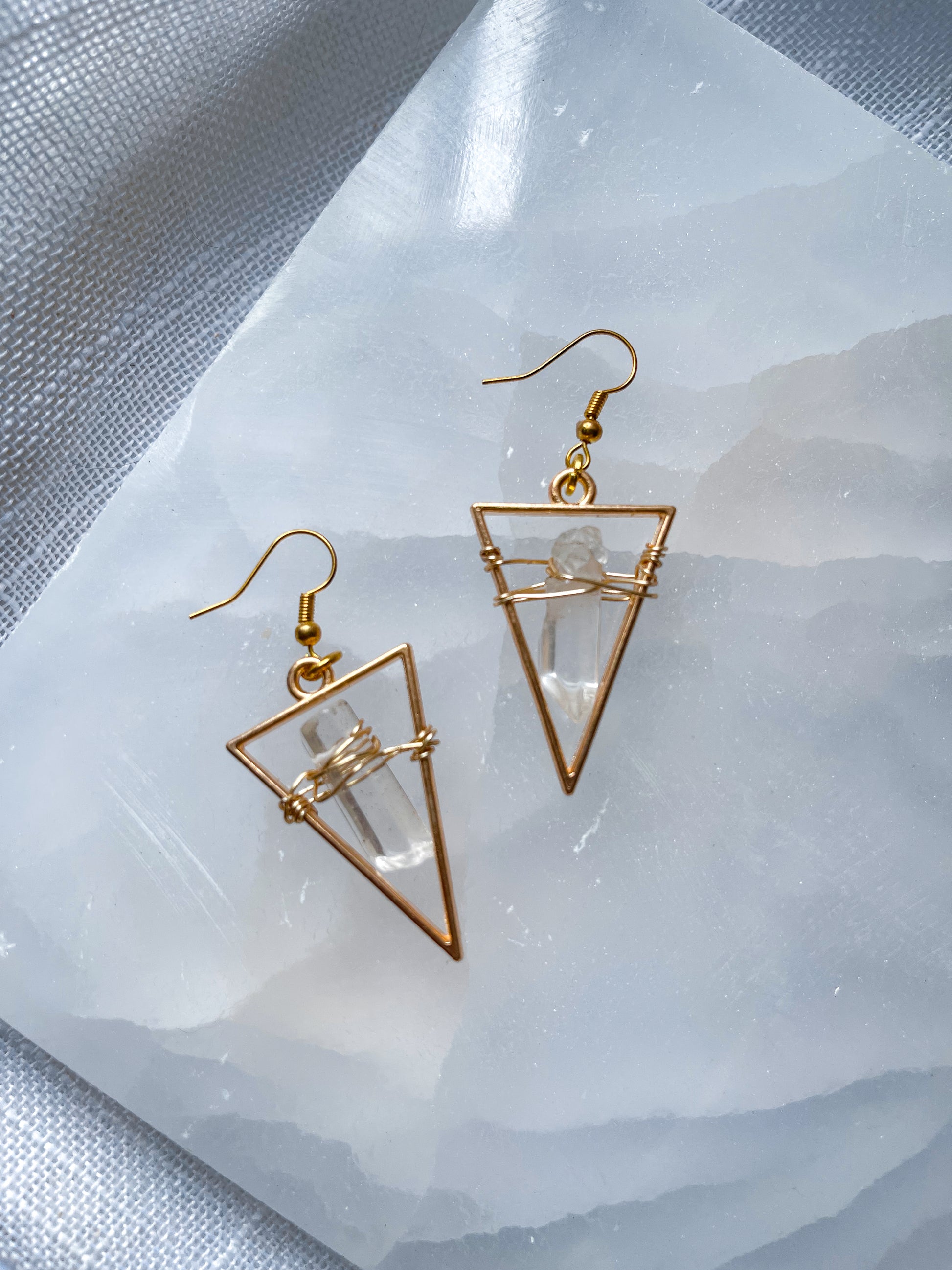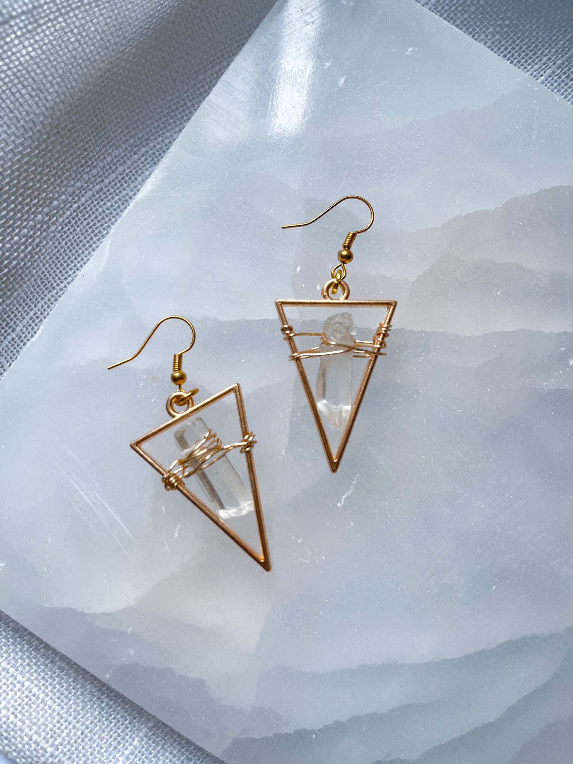 Bright Golden Star Quartz Crystal Triangle Geometric Earrings!