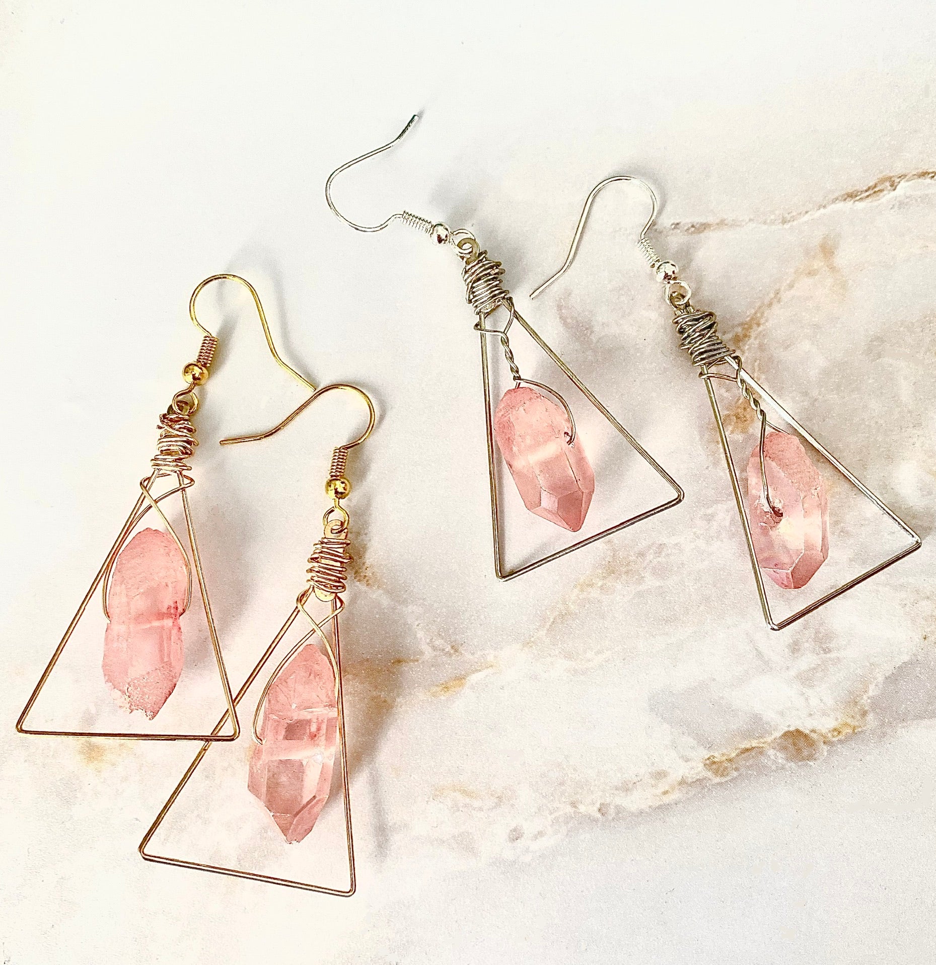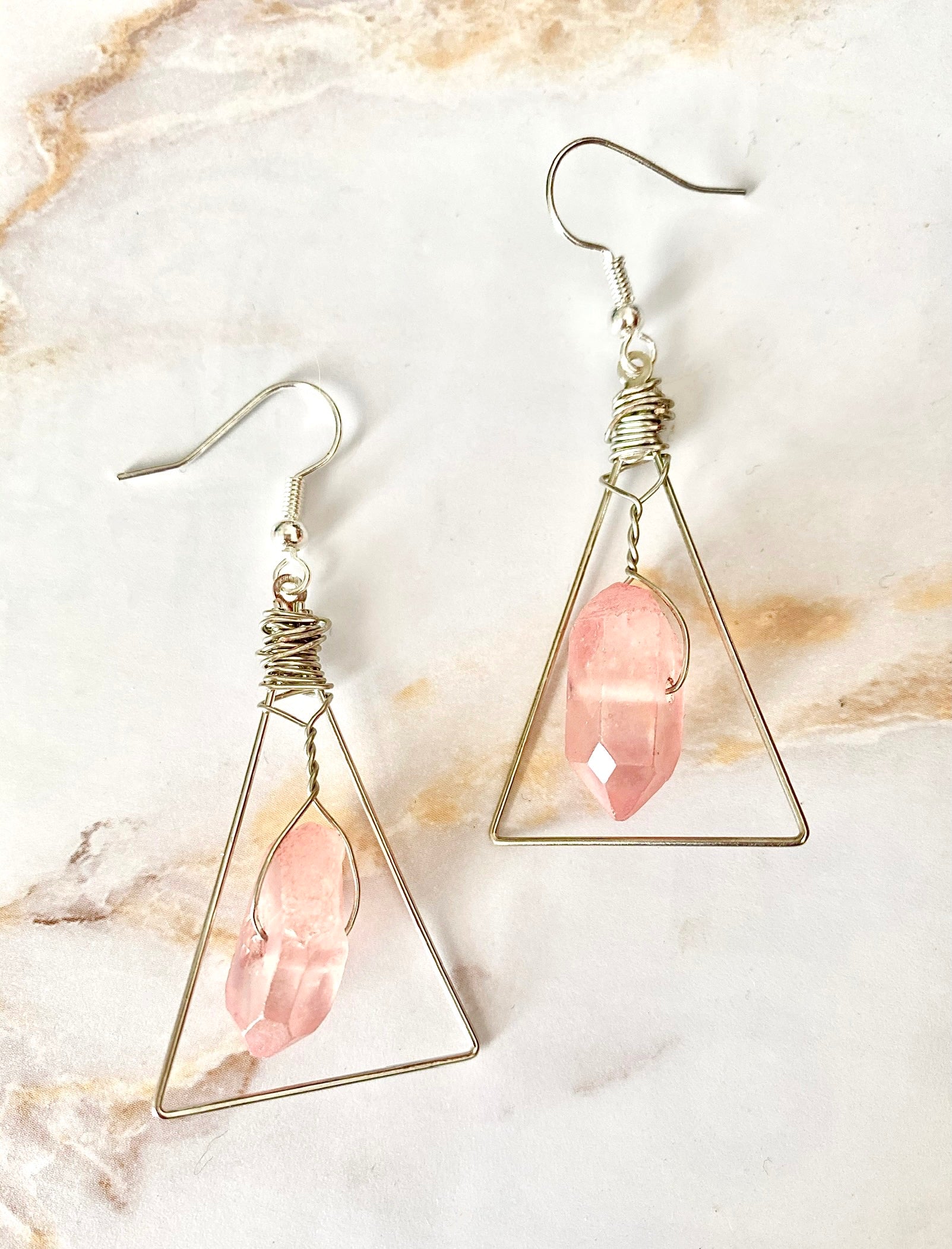 These are hand made wire wrapped Raw Rose Crystal Aura Quartz Earrings. Made to order. Each one will be different because each crystal is one of a kind. Each one has a slightly iridescent rainbow sheen.